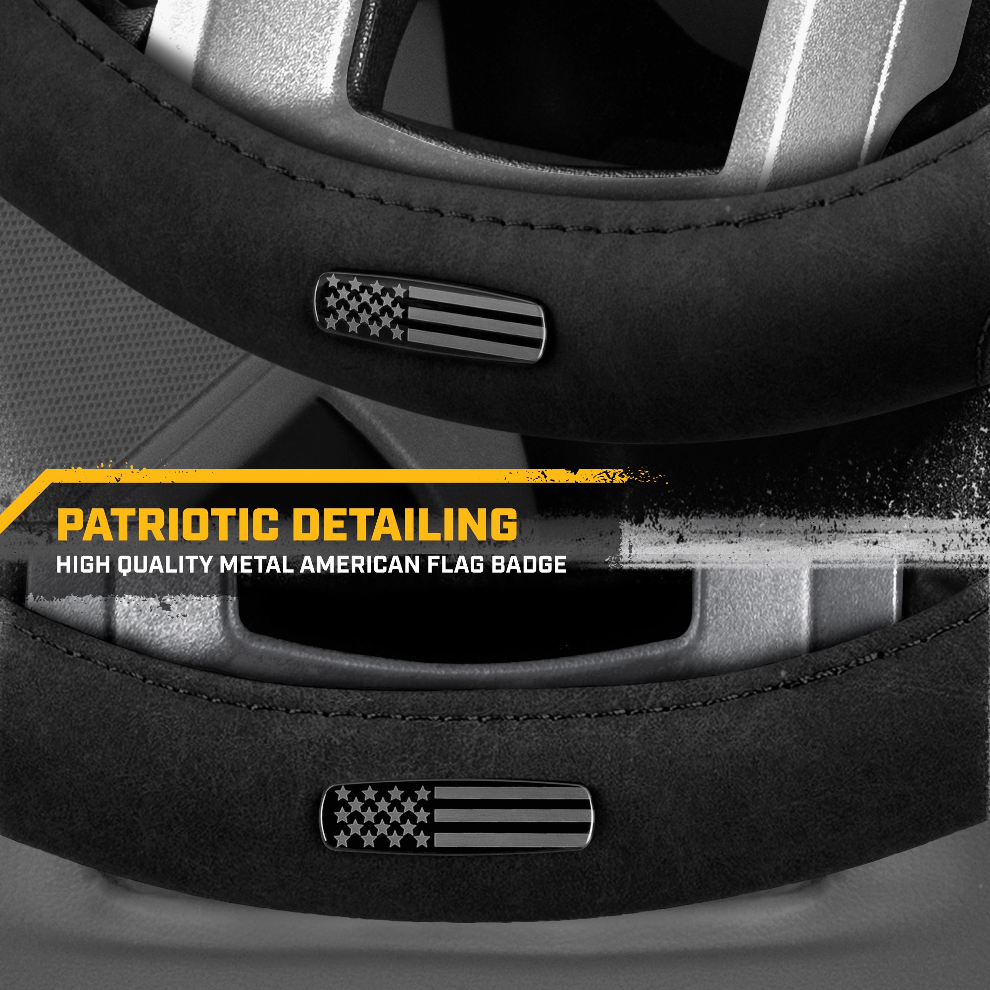 Cat® Honor Line Flux Leather Steering Wheel Cover w Metal Flag Emblem, Black Leatherette, Standard 14.5–15.5 Inch, Non Slip Comfort, Car Steering Wheel Cover for Auto Truck SUV, Car Accessories
