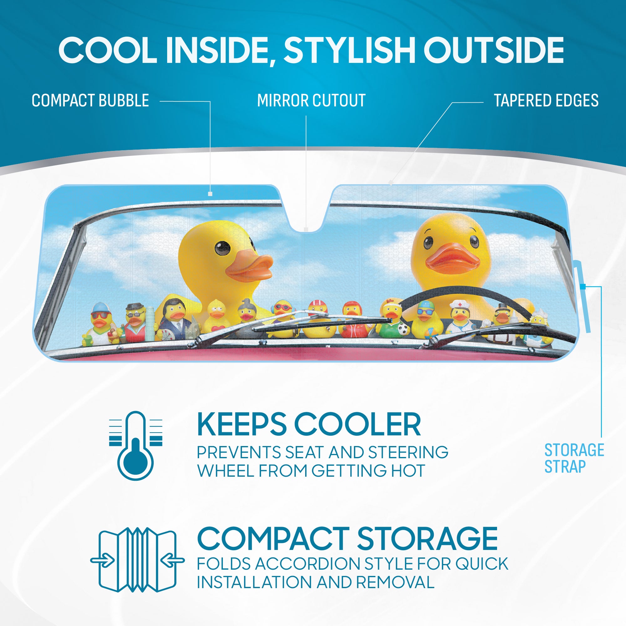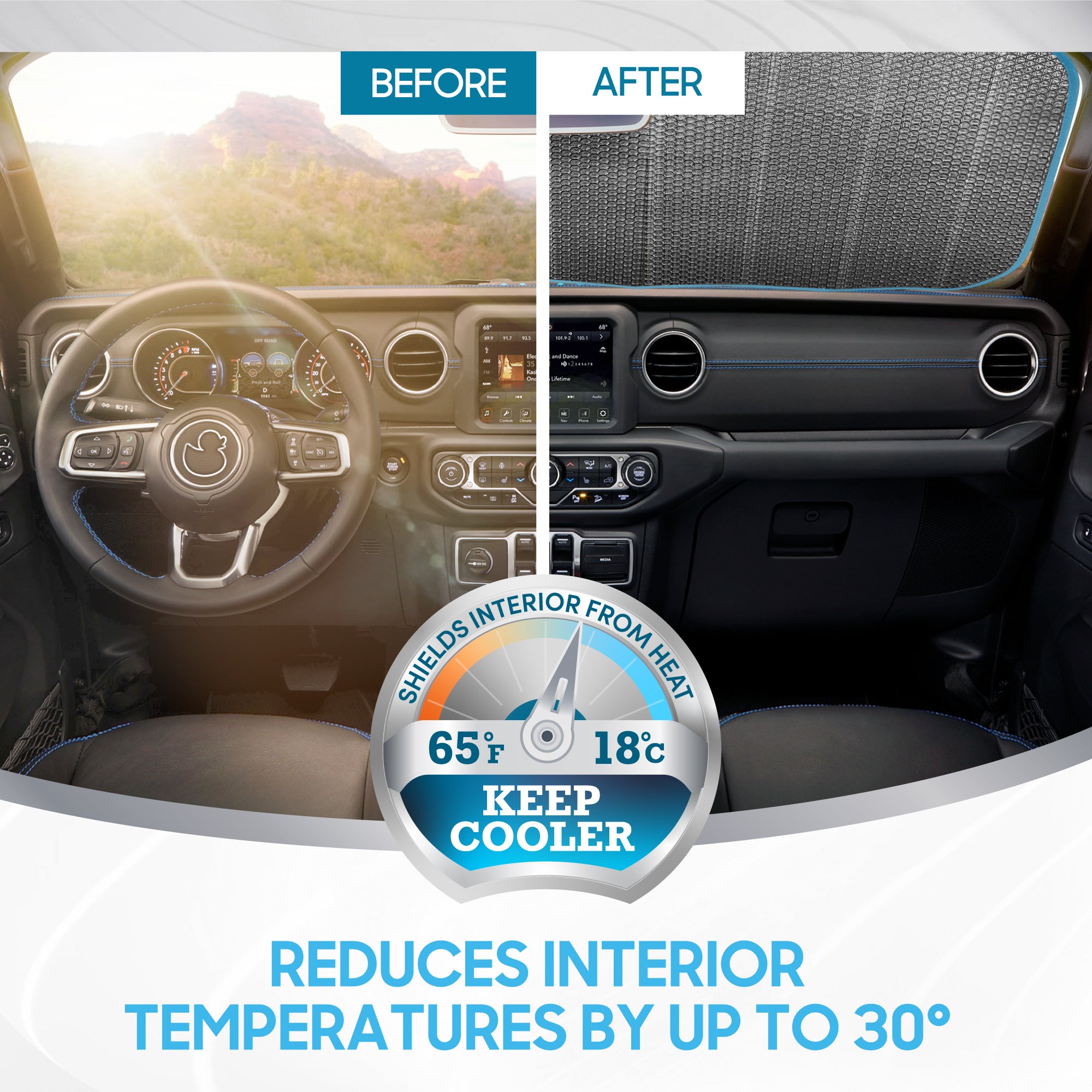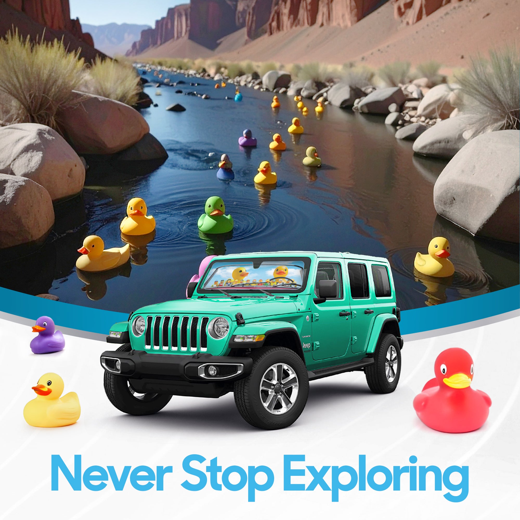 Keep your Jeep cool, comfortable, and protected with the Duck Duck Jeep Custom Fit Windshield Sun Shade. Designed specifically for Jeep enthusiasts, this premium-quality sunshade offers a perfect custom fit for the 2020–2021 Jeep Gladiator and all 1987–2020 Jeep Wrangler models, including JK, JL, CJ, YJ, and TJ. With dimensions of 53 inches by 16.5 inches, it provides edge-to-edge coverage to block out harmful UV rays and intense heat.<br/><br/>Made from high-density reflective materials, this Jeep windshield sun shade features multi-layer insulation that reflects over 99% of damaging ultraviolet rays, helping prevent dashboard cracks, faded interiors, and overheating. Whether you’re parked on the trail, at the beach, or just running errands, the Duck Duck Jeep sunshade keeps your cabin significantly cooler—reducing interior temperatures by up to 40 degrees Fahrenheit.<br/><br/>The foldable accordion-style design makes it quick and easy to install or remove. When not in use, it folds down flat for compact storage in your glove box, center console, or behind the seat. Built for durability, this Jeep sunshade stands up to extreme temperatures and rugged conditions, making it the perfect addition to your Jeep gear.<br/><br/>In true Jeep spirit, the design pays homage to the fun and community of the Duck Duck Jeep movement. It’s more than just a sunshade—it’s a functional accessory with a nod to the lifestyle you love. Whether you drive a Wrangler TJ, JK, JL, or a new Gladiator, this sunshade is made to fit perfectly and perform in all weather conditions.<br/><br/>Protect your investment, stay cool, and show your Jeep pride with the Duck Duck Jeep Perfect Fit Windshield Sun Shade. It's the ideal blend of protection, personality, and practicality for Jeep owners who live for the road ahead.
